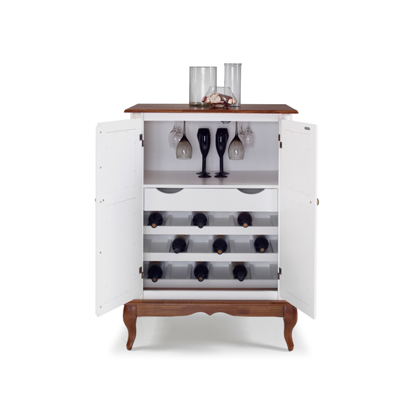 A Adega Hamelin é um móvel de qualidade e durabilidade, que combina modernidade e funcionalidade. Ela é ideal para a sua sala de jantar, pois valoriza a decoração do seu lar e se adapta a qualquer espaço. A adega tem 2 portas, 1 prateleira, 1 gaveta e um compartimento para guardar até 18 garrafas, oferecendo um ótimo espaço para você organizar seus vinhos e acessórios. A adega é feita de madeira taeda, com acabamento em verniz nos tons amadeirados e em MDF com acabamento laca nos tons coloridos. Os pés em luiz XV e os puxadores metálicos dão um toque especial de charme e elegância à peça.