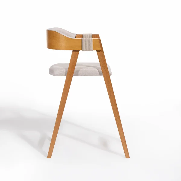 Fabricada em madeira maciça de eucalipto, a banqueta exibe a beleza natural da madeira com acabamento refinado. O assento estofado proporciona toque macio e aparência leve, enquanto o encosto curvo com detalhe em cordão confere um charme artesanal e exclusivo.