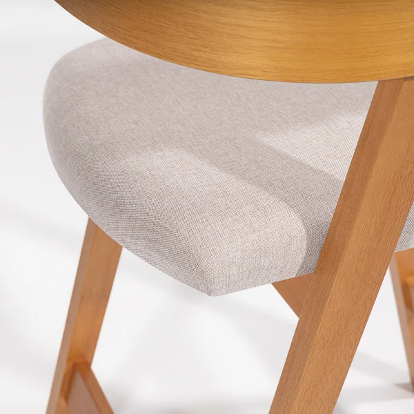 A estrutura em madeira maciça de eucalipto assegura resistência e longevidade, enquanto o assento estofado em linho Pinhão ou couro sintético creme proporciona maciez e elegância. Cada detalhe é cuidadosamente trabalhado para combinar beleza e funcionalidade.
