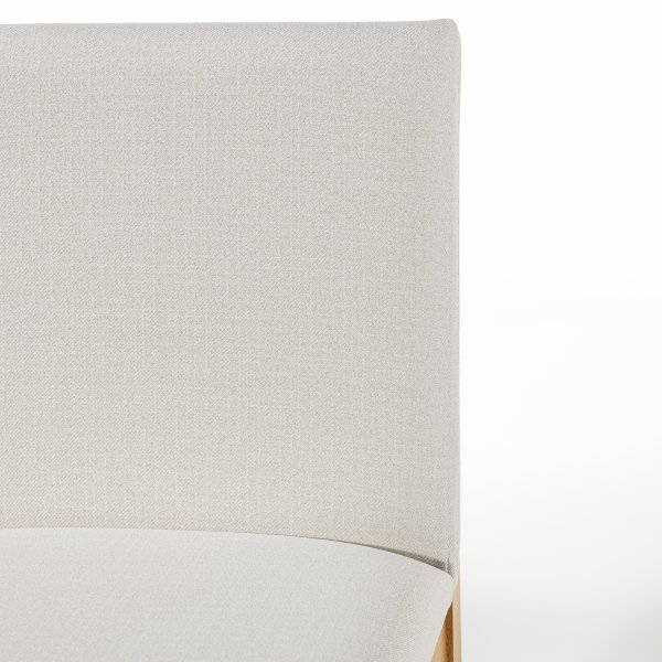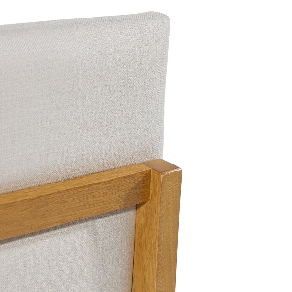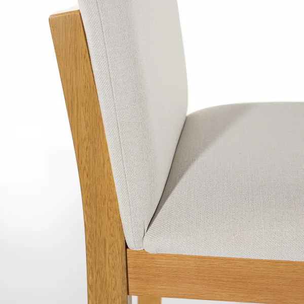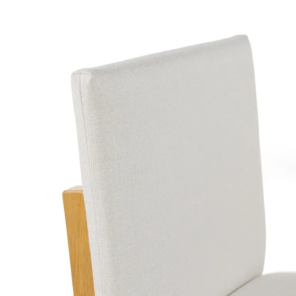 Sua estrutura é feita em madeira maciça de eucalipto, reconhecida pela durabilidade e resistência. O assento é acolchoado com espuma de alta densidade e revestido em tecido linho off white, garantindo conforto e elegância.