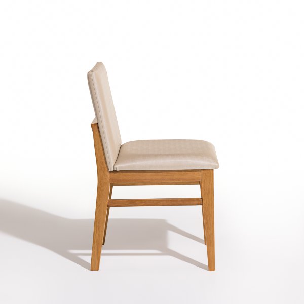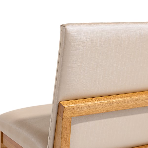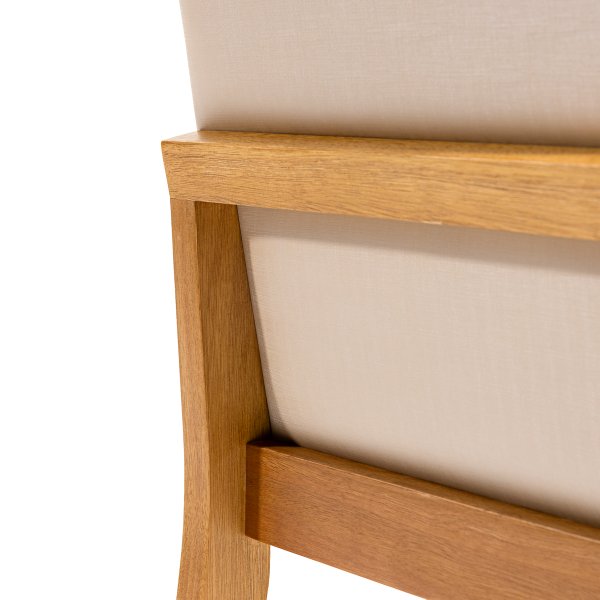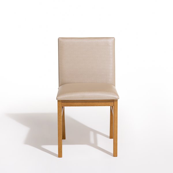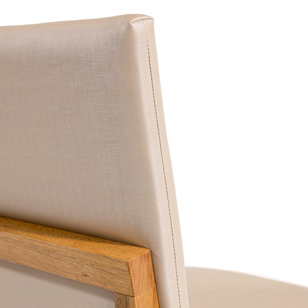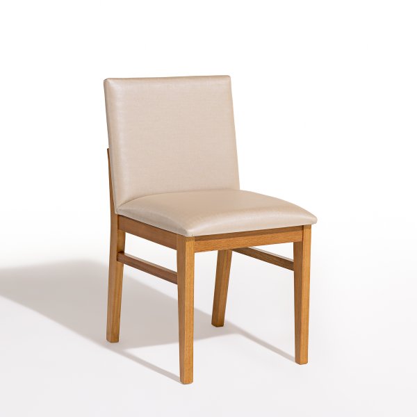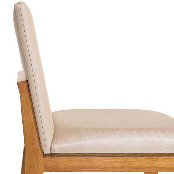 A estrutura da cadeira é confeccionada em madeira maciça de eucalipto, conhecida por sua resistência e durabilidade. O assento e o encosto são estofados com espuma de alta densidade, revestidos em tecido linho off white, proporcionando conforto e um toque de sofisticação ao ambiente.