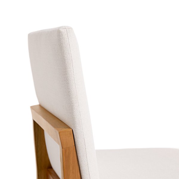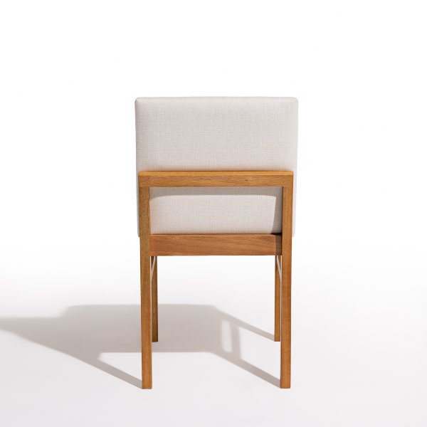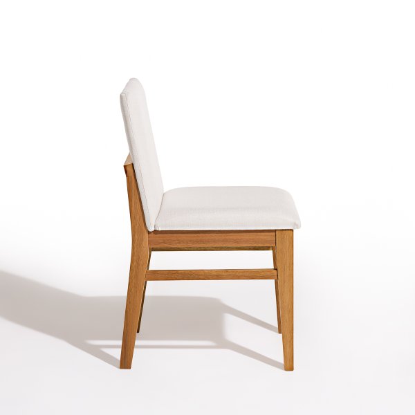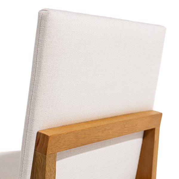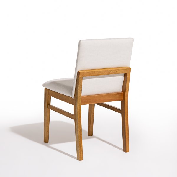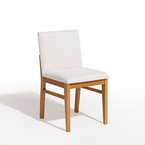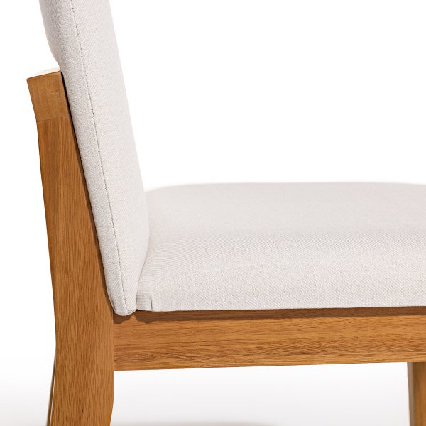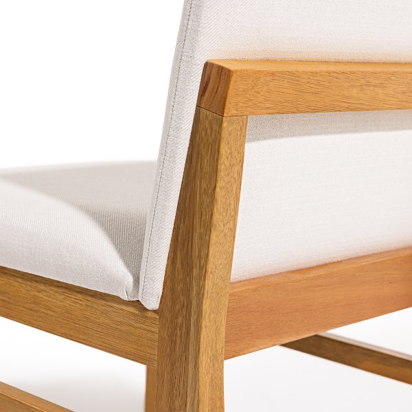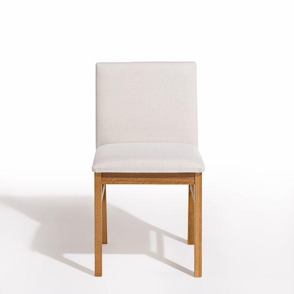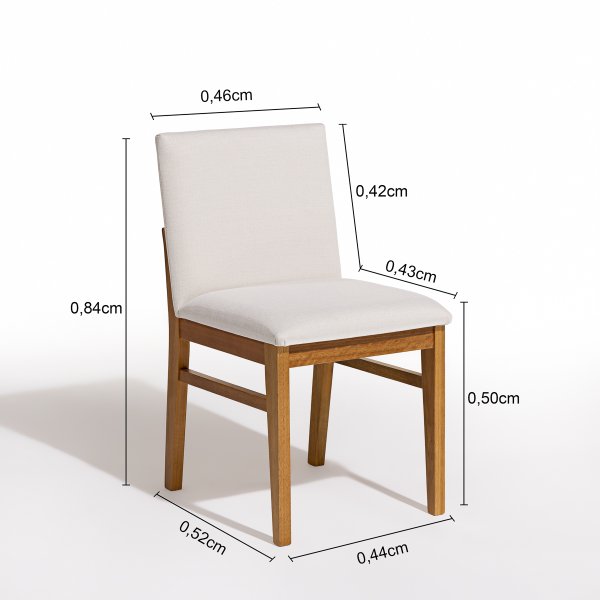 A estrutura da cadeira é confeccionada em madeira maciça de eucalipto, conhecida por sua resistência e durabilidade. O assento e o encosto são estofados com espuma de alta densidade, revestidos em tecido linho off white, proporcionando conforto e um toque de sofisticação ao ambiente.