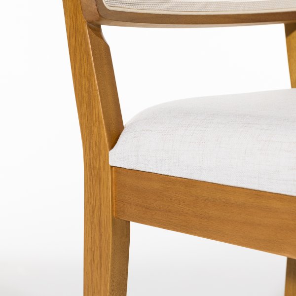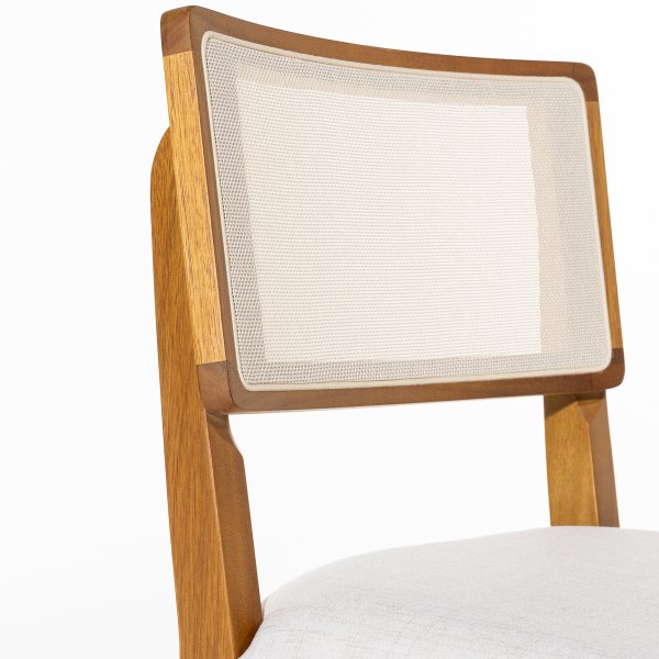 A estrutura em madeira maciça de eucalipto na tonalidade pinhão confere um visual sofisticado e resistência incomparável. O encosto em telinha sextavada natural adiciona leveza ao design, garantindo um charme artesanal e um toque rústico-chique à peça. Esse detalhe permite a circulação de ar, proporcionando mais conforto térmico e um visual único. O assento estofado em tecido linho palha traz suavidade e um toque aconchegante, além de harmonizar perfeitamente com a estrutura da madeira. Seu design versátil permite que a cadeira se adapte a diversos estilos de decoração, desde os mais clássicos até os contemporâneos.