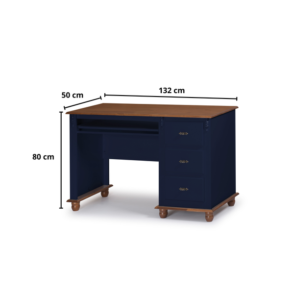 Transforme seu home office em um espaço confortável e funcional com a mesa de escritório de madeira. Ela tem um design elegante e sofisticado, com 3 gavetas espaçosas que deslizam suavemente e permitem organizar seus documentos e objetos pessoais. A mesa é feita de madeira taeda de alta qualidade, com acabamento em verniz nos tons amadeirados e em MDF com acabamento laca nos tons coloridos. Escolha a cor que mais combina com o seu estilo e aproveite o conforto e a praticidade da mesa de escritório de madeira.