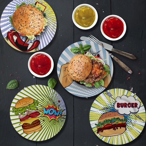 Kit 8 Peças Burguer Collection c/ Mini Molheira Branco Perola é um conjunto de 8 peças, feito em cerâmica Faiança Feldspática, que se destaca pela sua variedade de cores e estampas harmoniosas. O kit contém 4 pratos de sobremesa com 4 estampas diferentes e 4 molheiras. As peças vêm em uma linda caixa litografada. Esse kit vai valorizar a sua mesa e deixar o seu jantar mais elegante, convidativo e saudável, pois não libera substâncias tóxicas.