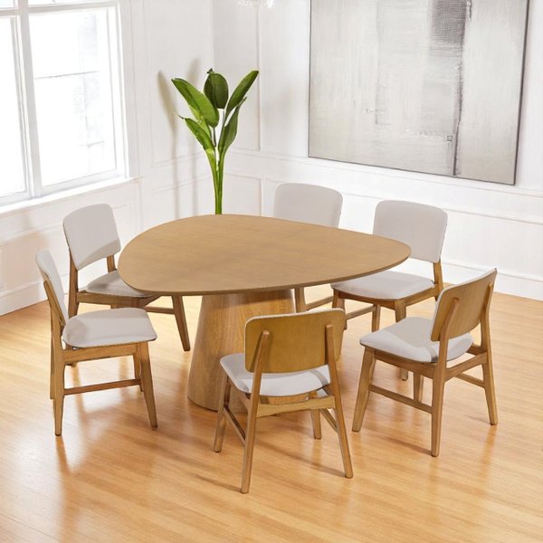 A Mesa de Jantar Palheta Lyon é o ponto de encontro perfeito entre arte e funcionalidade. Com seu formato orgânico em palheta — fluido e assimétrico — ela traz leveza visual e um toque contemporâneo ao ambiente. Seu tampo em madeira laminada tauari e base cônica evocam sofisticação escandinava com alma brasileira.