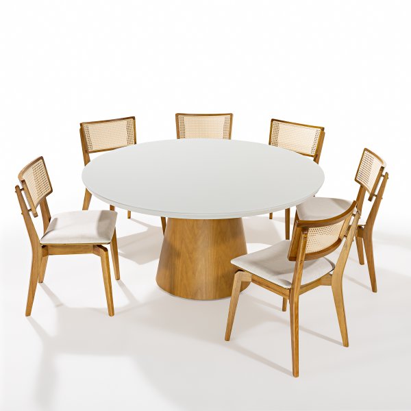A Mesa de Jantar Denver é a peça central que transforma qualquer ambiente, unindo estilo, funcionalidade e conforto. Com um design redondo e contemporâneo, ela possui um tampo de vidro off-white de 150 cm de diâmetro, proporcionando amplo espaço para refeições e reuniões. Sua estrutura em madeira na cor Pinhão oferece um toque de elegância e calor, adaptando-se facilmente a diversos estilos de decoração, desde o industrial até o rústico.